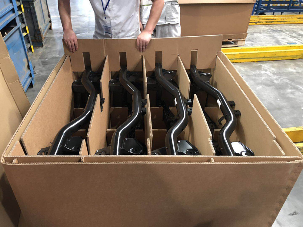 重載型五層瓦楞箱,采用AAA級牛卡紙+蜂窩加固結構,通過汽車物流TL/SL測試標準。內置分隔襯板,可固定發動機/變速箱等不規則部件。